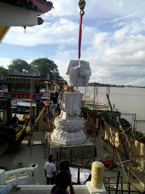 安座工作大约在当天下午125分开始,当吊车把第一片莲花座放下,工匠洒下第一把洋灰时,鲁巴河河潮就在此时涨起,甘露即时从天降;似乎是天龙八部天将天兵降临道场护法圆满功德,也如慈云法雨沾施众生净化道场!令在场的理事工作人员深感菩萨得道灵显。145分天晴,安座工作按计划在熟练的厂方员工指导下逐件拼组,成全工程。